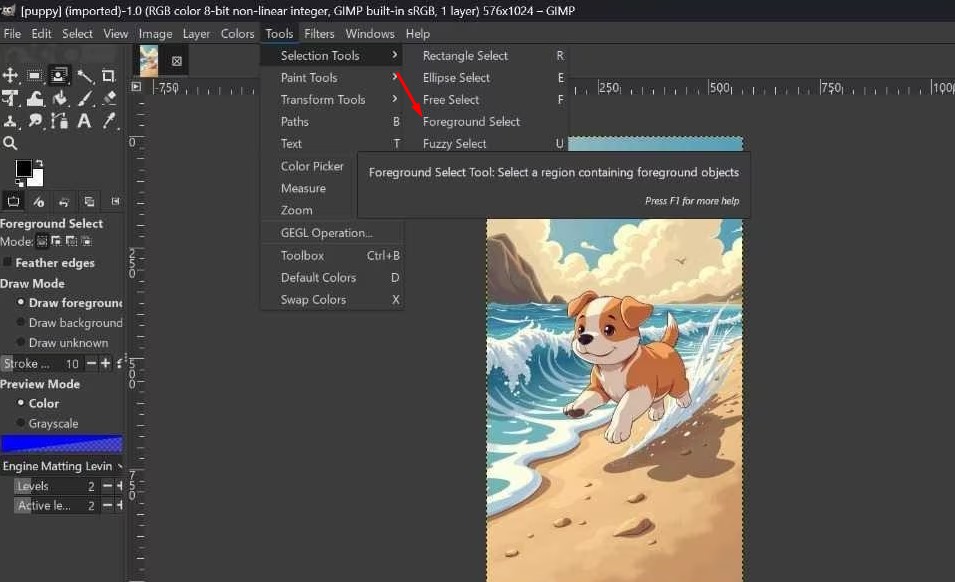 How it works: You roughly outline the subject, then “paint” over it so GIMP can intelligently separate foreground from background.