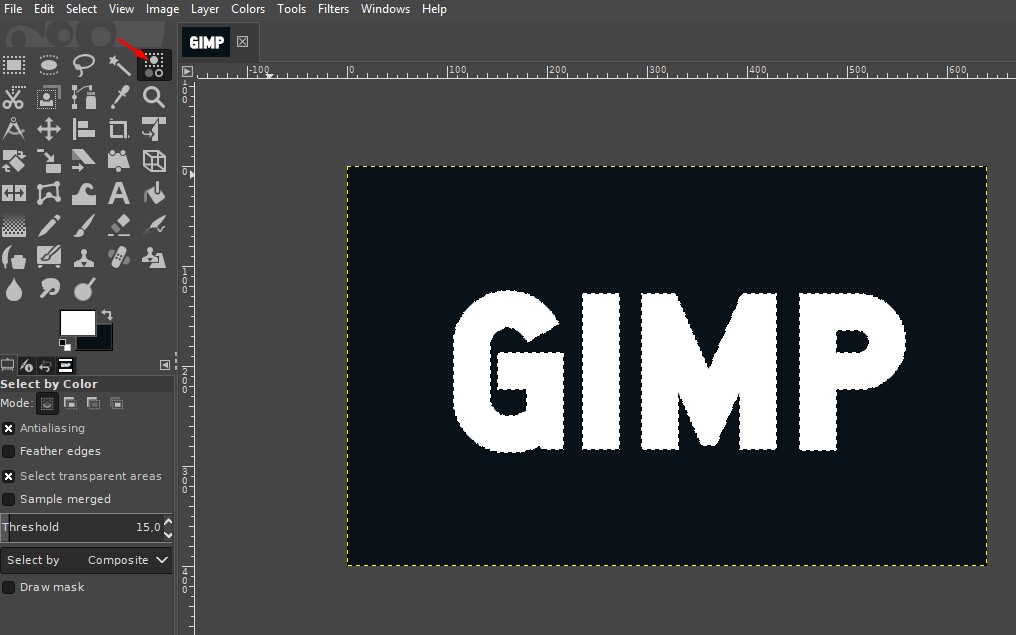 How it works: Unlike Fuzzy Select, this tool selects similar colors across the entire image—not just connected areas.